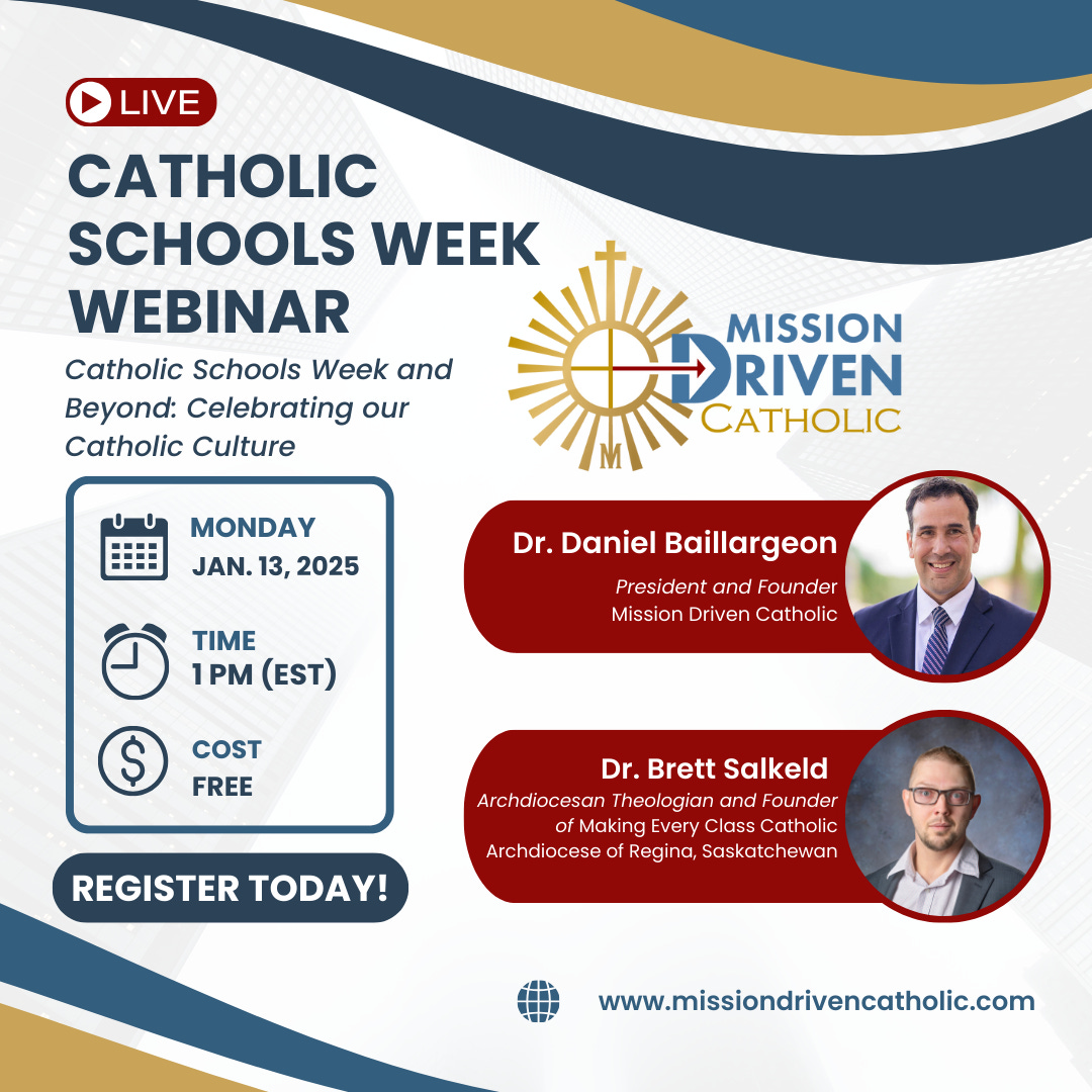 We hope you can join us this Monday, Jan. 13th at 1pm for a discussion about Catholic culture and Catholic Schools Week. Dr. Dan Baillargeon will be joined by Dr. Brett Salkeld, founder of Making Every Class Catholic, and author of Educating for Eternity.